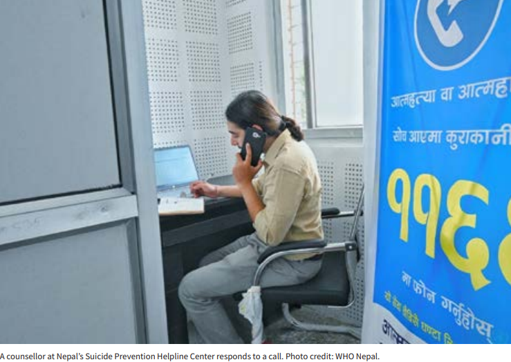 In 2020, the Government of Nepal activated its humanitarian cluster system to coordinate the emergency response to the COVID-19 pandemic, including a Mental Health and Psychosocial Support (MHPSS) coordination platform coled by the Government and WHO Nepal. WHO Nepal provided technical support for subcluster meetings, attended by representatives from NGOs, Government offices, experts, academia and members of the public with lived experience of mental health problems. By November 2022, partners had provided psychosocial support to over 40 000 people, including 20 000 children and 3000 health providers. This included the launch of the “1166” National Suicide Prevention Hotline which by November 2022 had received 1764 calls from people with suicidal ideations or mental health concerns; and the school Mental Health Initiative which provided training and supervision to school nurses and teachers. One hundred and sixteen school nurses and 269 schoolteachers across 120 schools in Bagmati Province were trained in social-emotional learning, mental health screening and initial management. It is anticipated that this will benefit 10 000 children and adolescents.