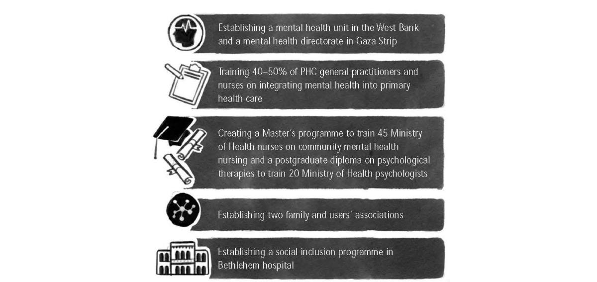 Since 2011, the Strategic Operational Plan has been integrating mental health services into all governmental primary health care facilities in Gaza Strip and 12 primary health centres in the West Bank. It has also worked to integrate mental health care into two general hospitals in Gaza Strip and incorporate social inclusion programmes in the two psychiatric hospitals and all community mental health centres in the West Bank and Gaza Strip.