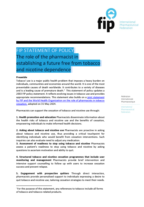 The International Pharmaceutical Federation (FIP) is the global federation of 156 national organisations of pharmacists and pharmaceutical scientists, representing over four million pharmacists, pharmaceutical scientists and pharmacy educators worldwide. Our vision is a world where everyone benefits from access to safe, effective, quality and affordable medicines and pharmaceutical care. We endeavour to advance the role of the pharmacist through such partnerships as our official NGO status with the World Health Organization. Our mission is to support global health by enabling the advancement of pharmaceutical practice, sciences and education.