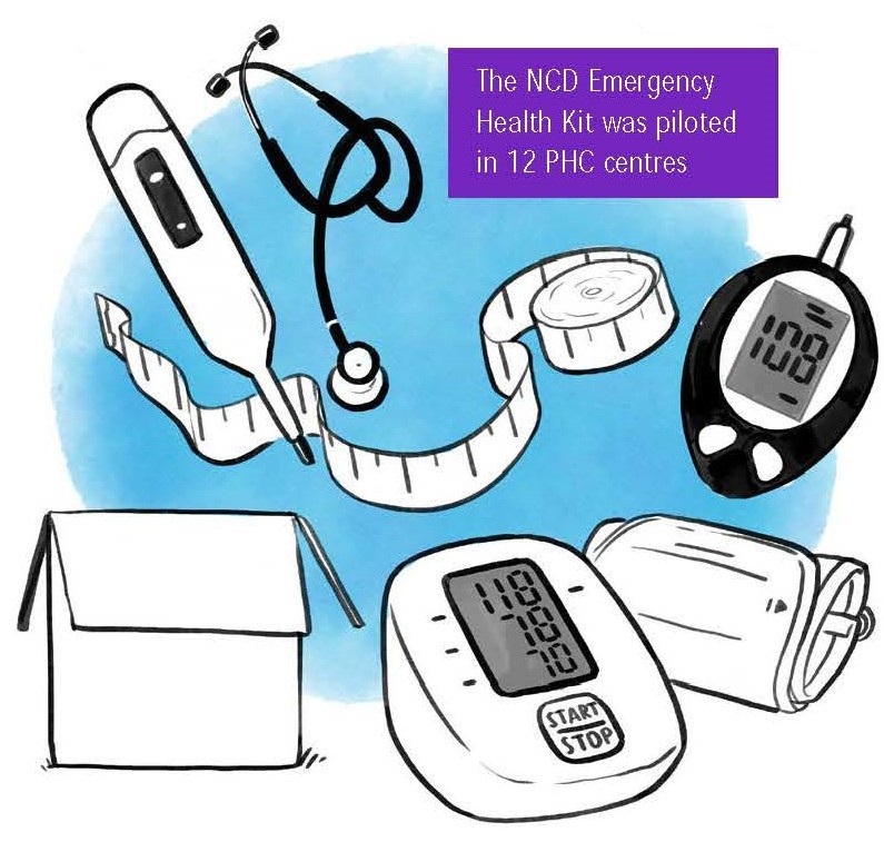 WHO has piloted the NCD Emergency Health Kit in 12 primary health care centres to help people manage diabetes, hypertension, chronic respiratory disease, and certain mental health conditions.