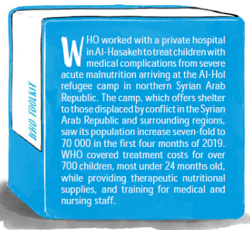In 2016, WHO established the Gaziantep Hub for northwest Syria in order to provide mental health and psychosocial support alongside NCD initiatives, including the training of over 200 physicians. The Gaziantep Hub then piloted the introduction of the NCD Emergency Health Kit to three primary health care centres in 2018 and nine more centres across north-west Syrian Arab Republic in 2019. Each NCD kit provides the medicines, devices and supplies required to meet the priority NCD health needs of 10 000 people for three months.