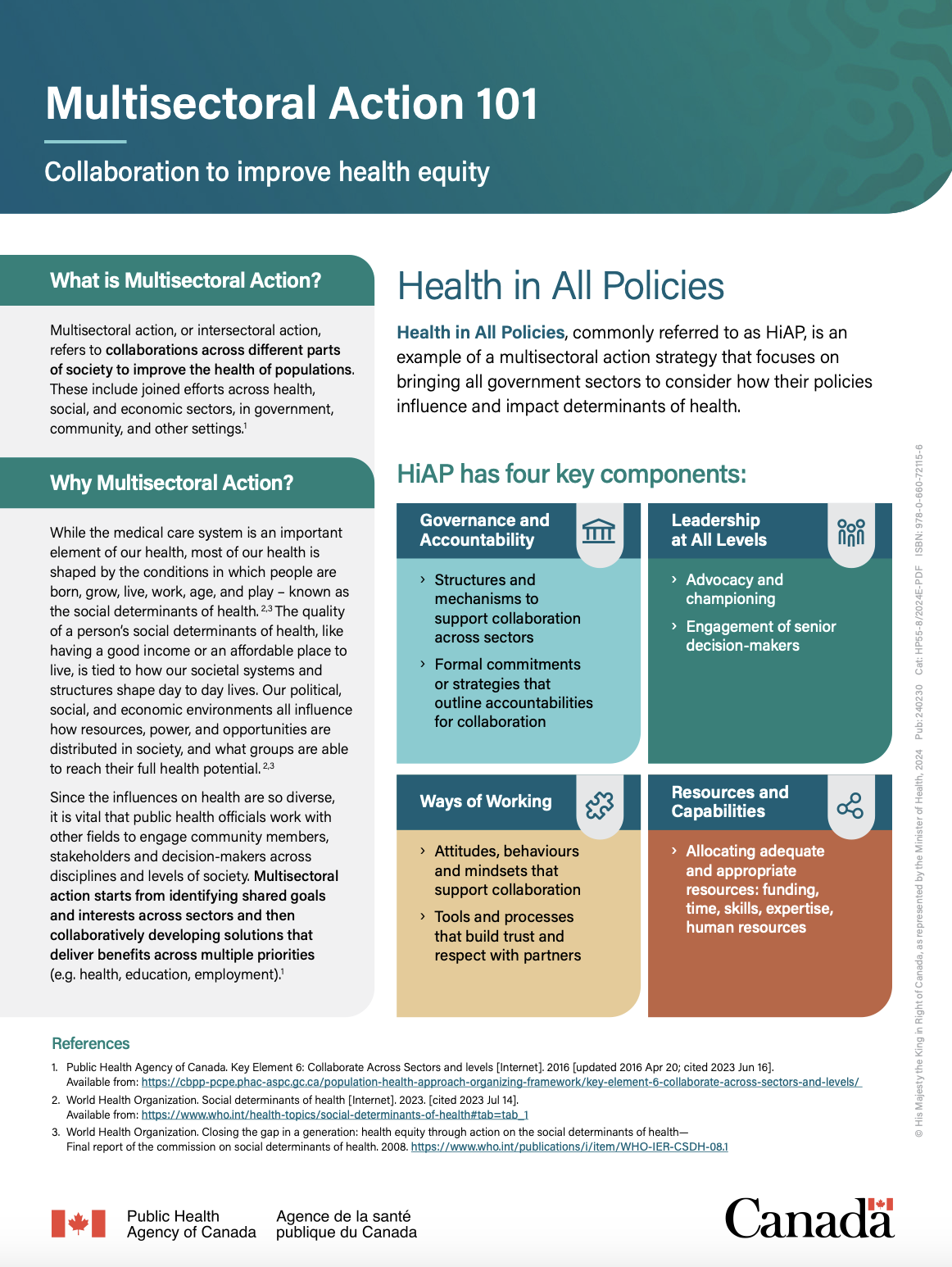 The Public Health Agency of Canada has developed a series of factsheets to highlight multisectoral action as a strategic policy approach to advance action on the social determinants of health and health equity: