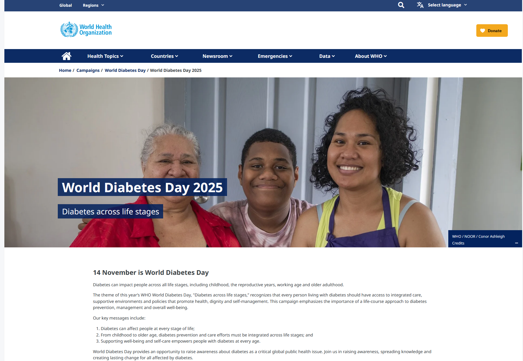 For World Diabetes Day 2025, this content collection assembles knowledge resources, advocacy tools and latest campaign news by Participants of the WHO Global Coordination Mechanism on NCDs and WHO. Priority topics of this year are diabetes across life stages and at the workplace, with additional country activity highlights and resources on access to essential medicines and health technologies.